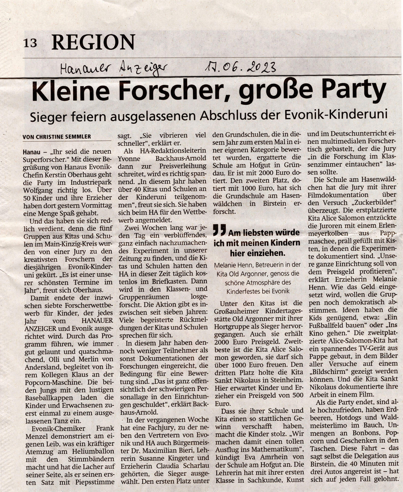 Zwei Wochen lang wurde uns der Hanauer Anzeiger geliefert, in dem jeden Tag ein anderer Versuch beschrieben wurde. Die beiden Erzieherinnen Frau Nikscha und Frau Khandan Nemati haben mit den Kindern, die sich dafür interessiert haben, die Versuche durchgeführt und am Ende einen kleinen Film dazu gemacht. Der Film wurde dann beim Wettbewerb eingereicht.