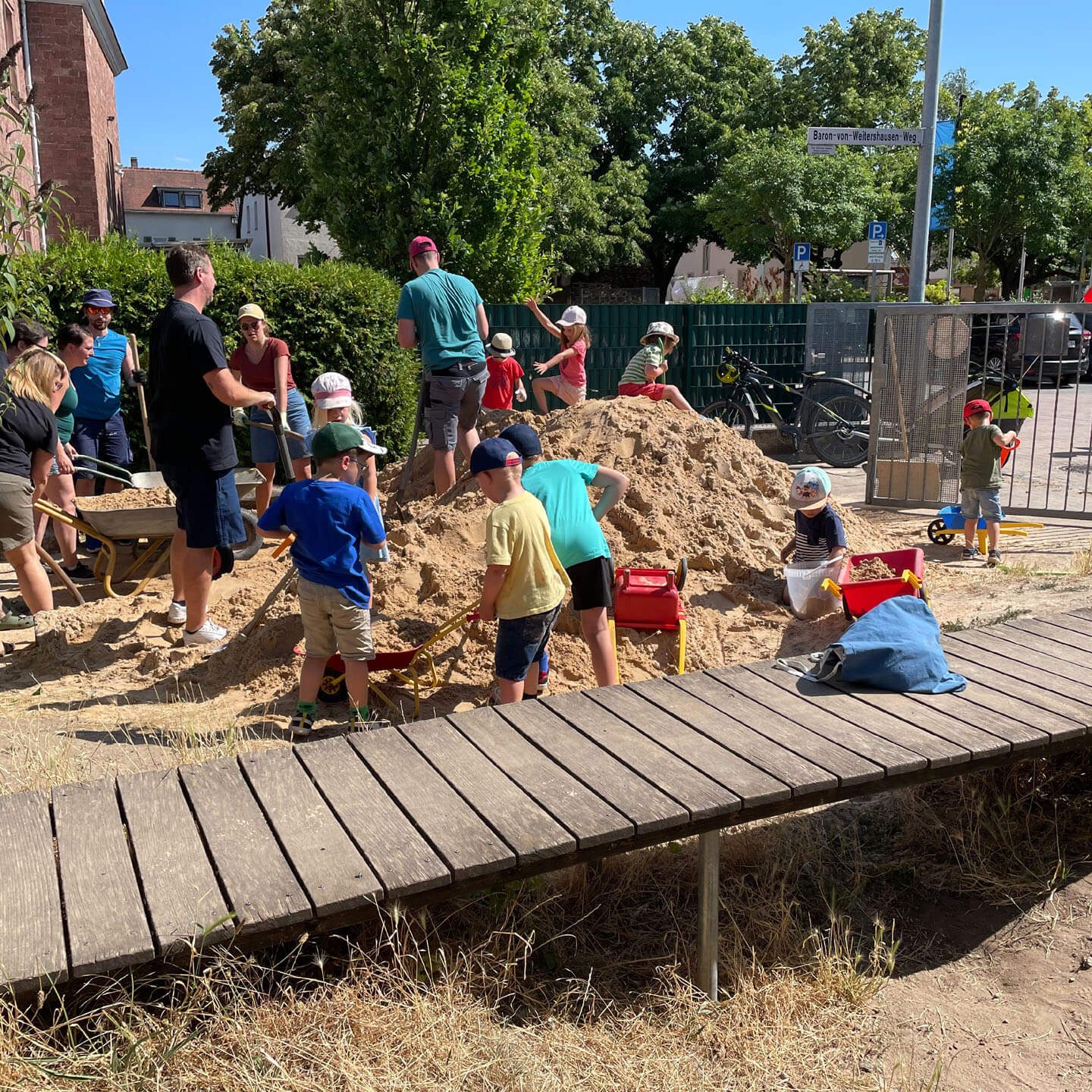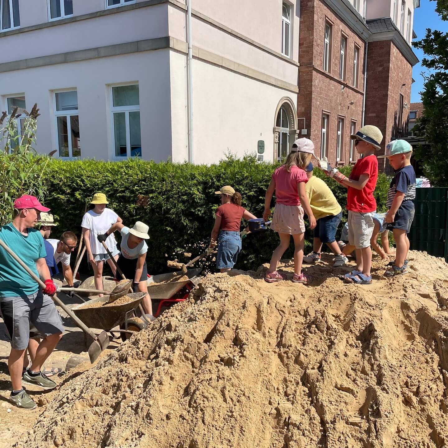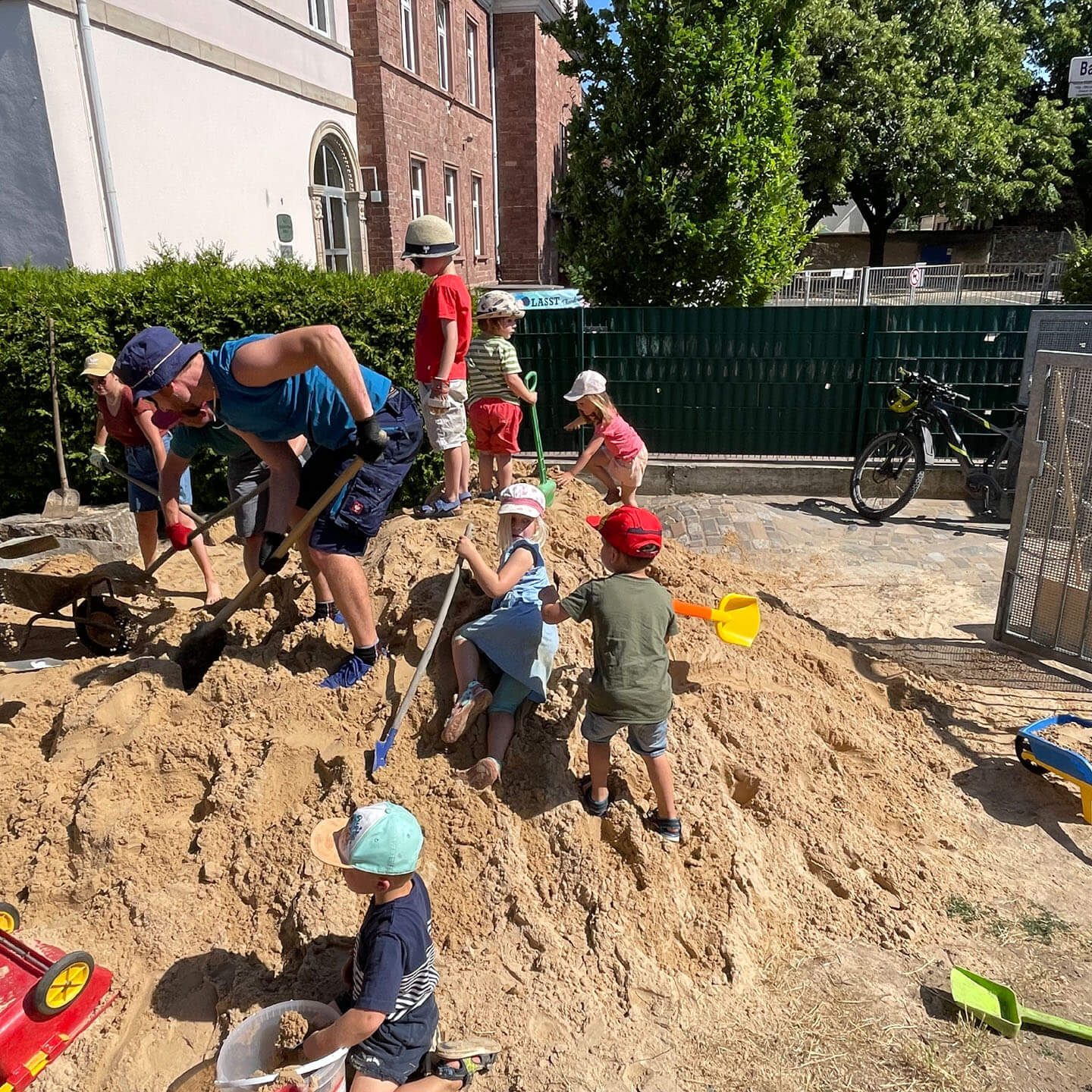 In den letzten Jahren ist unser Spielsand immer weniger geworden. Es wurde neuer Sand bestellt. Leider kommt der LKW nicht bis zum Spielbereich und muss den Sand direkt hinter der Spielplatztür abladen. Das heißt: 15 Tonnen Sand zum richtigen Platz transportieren. Zum Glück haben sich auch diesmal wieder Eltern und Kinder gefunden, die geholfen haben, den Sand hinzufahren, wo er hingehört. Dabei gab es Arbeitsteilung: ein Teil der Eltern und Kinder hat die Schubkarren gefüllt, die anderen haben den Sand zum Sandbereich gefahren und wieder andere haben den Sand dann richtig verteilt. Einige der Eltern, die zum Abholen ihres Kindes kamen, haben auch spontan geholfen. Gegen den Durst und die Hitze gab es für alle kalte Getränke.