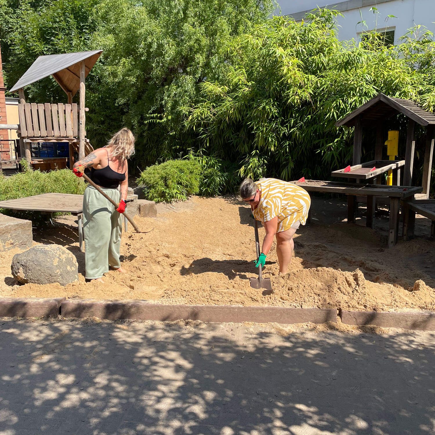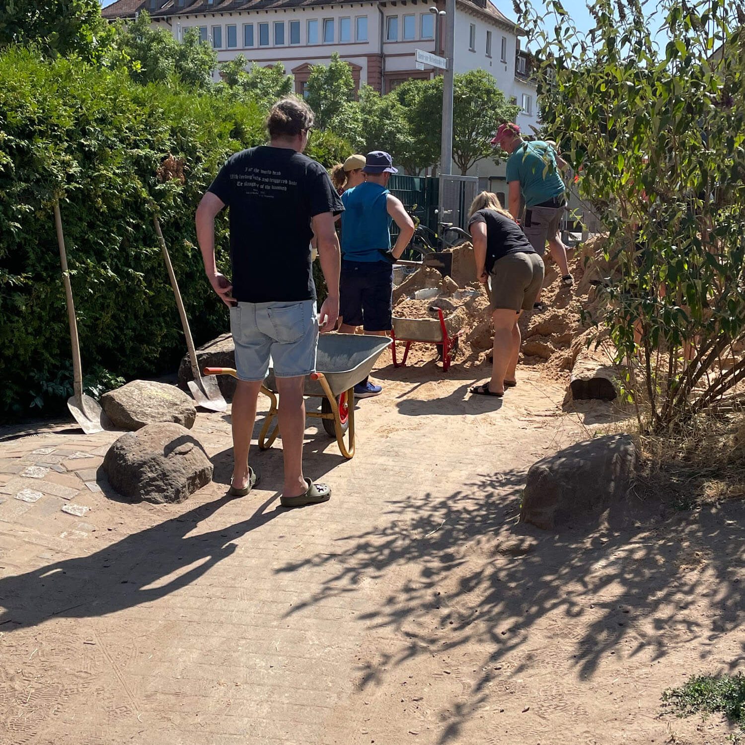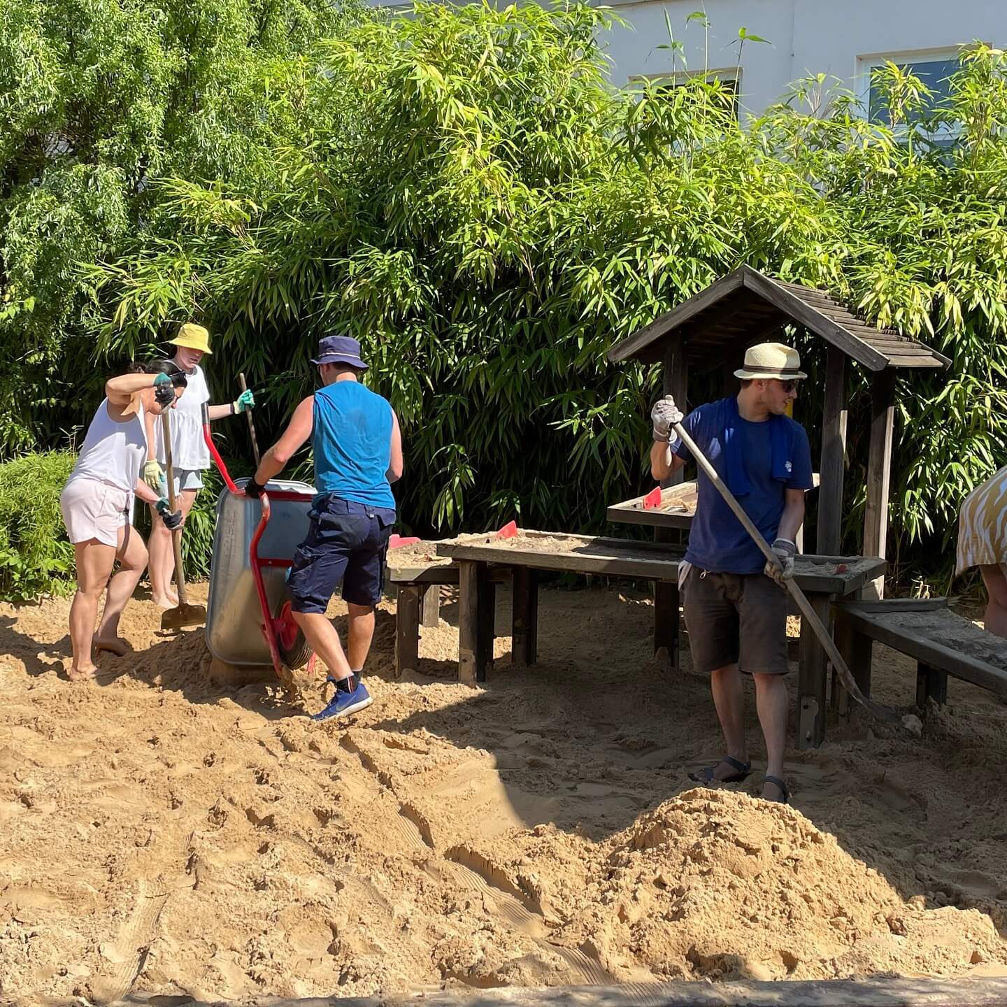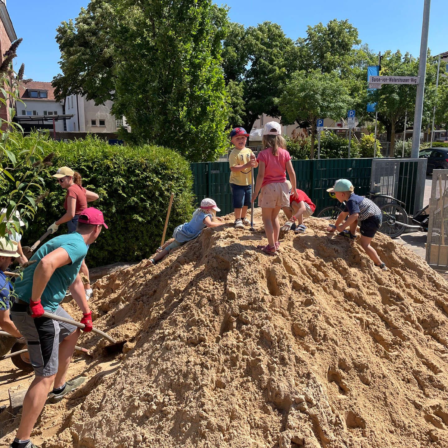 In den letzten Jahren ist unser Spielsand immer weniger geworden. Es wurde neuer Sand bestellt. Leider kommt der LKW nicht bis zum Spielbereich und muss den Sand direkt hinter der Spielplatztür abladen. Das heißt: 15 Tonnen Sand zum richtigen Platz transportieren. Zum Glück haben sich auch diesmal wieder Eltern und Kinder gefunden, die geholfen haben, den Sand hinzufahren, wo er hingehört. Dabei gab es Arbeitsteilung: ein Teil der Eltern und Kinder hat die Schubkarren gefüllt, die anderen haben den Sand zum Sandbereich gefahren und wieder andere haben den Sand dann richtig verteilt. Einige der Eltern, die zum Abholen ihres Kindes kamen, haben auch spontan geholfen. Gegen den Durst und die Hitze gab es für alle kalte Getränke.